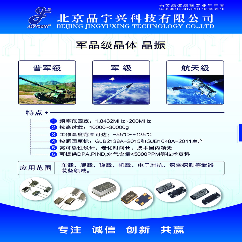 Beijing Jingyuxing Technology Co., Ltd. has been deeply engaged in the development of quartz crystal oscillator industry for more than 20 years. It is a professional crystal oscillator manufacturer integrating research and development, production and sales. The company was founded adhering to the focus, integrity, innovation, mutualism business philosophy, has a strong professional and technical team and perfect pre-sales and after-sales service system.and has passed the certification of IATF 16949 and military standard GJB 9001C system.